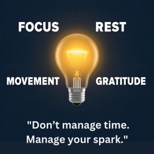 “আপনার আরও সময় দরকার নয়। দরকার আরও শক্তি — আর তা শুরু হয় প্রতিটি মুহূর্তকে কীভাবে আপনি বাঁচেন, তা দিয়ে।”