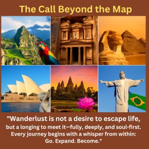 Wanderlust is sacred yearning. It’s the soul’s GPS reminding us we are not meant to stay in one place—in body or spirit. We are born to cross thresholds, not just of land, but of perspective. To stand before Machu Picchu or Petra is to remember that human hands once touched the divine with stone—and maybe, so can we.